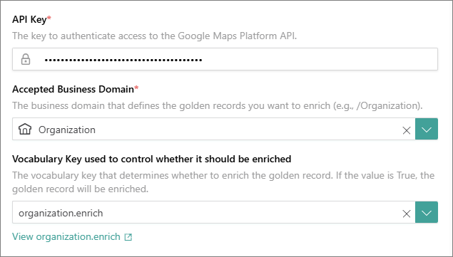 When you’re configuring the Google Maps enricher for a specific business domain, make sure you fill in the relevant fields for that business domain.